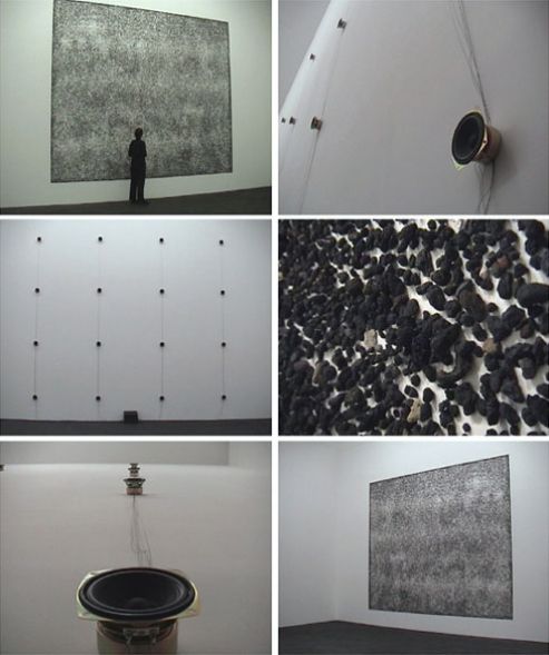 ![]() The Volcano Gate, 1999, Centre Regional D´Art, Sete, France In collaboration with Ragna Robertsdottir The premise of the work is the belief in the Middle Ages that the gate to hell was through the crater of ![]() I perceive emissive noise-sound from the FM receiver to be the basic sound of the work. It is sent through a programmer which divides it into two rotating channels and forms two parallel circles around 16 loudspeakers warping the sound to Ragna Róbertsdóttir's pumice-work. ![]() Material: 16 loudspeakers, amplifiers, programmer, FM-receiver Pumice from Hekla glued directly onto the wall. |